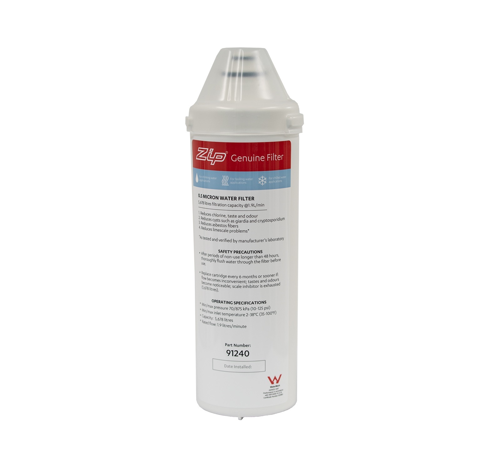 The unique 91240 Cartridge Filter reduces dirt, rust, sediment, chemicals, chlorine, taste & odours from your water supply while protecting your Zip Hydrotap from internal scale-up.